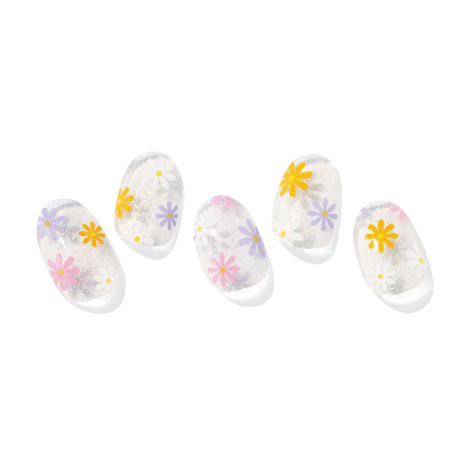 A vibrant daisy nail design that blooms under the sparkling sunlight! The playful hand-drawn daisies in pink, yellow, and purple pop against an iridescent opal film glitter base, shifting colors beautifully with every angle. This lively, eye-catching design captures the cheerful energy of spring, bringing a fresh and whimsical touch to your fingertips.