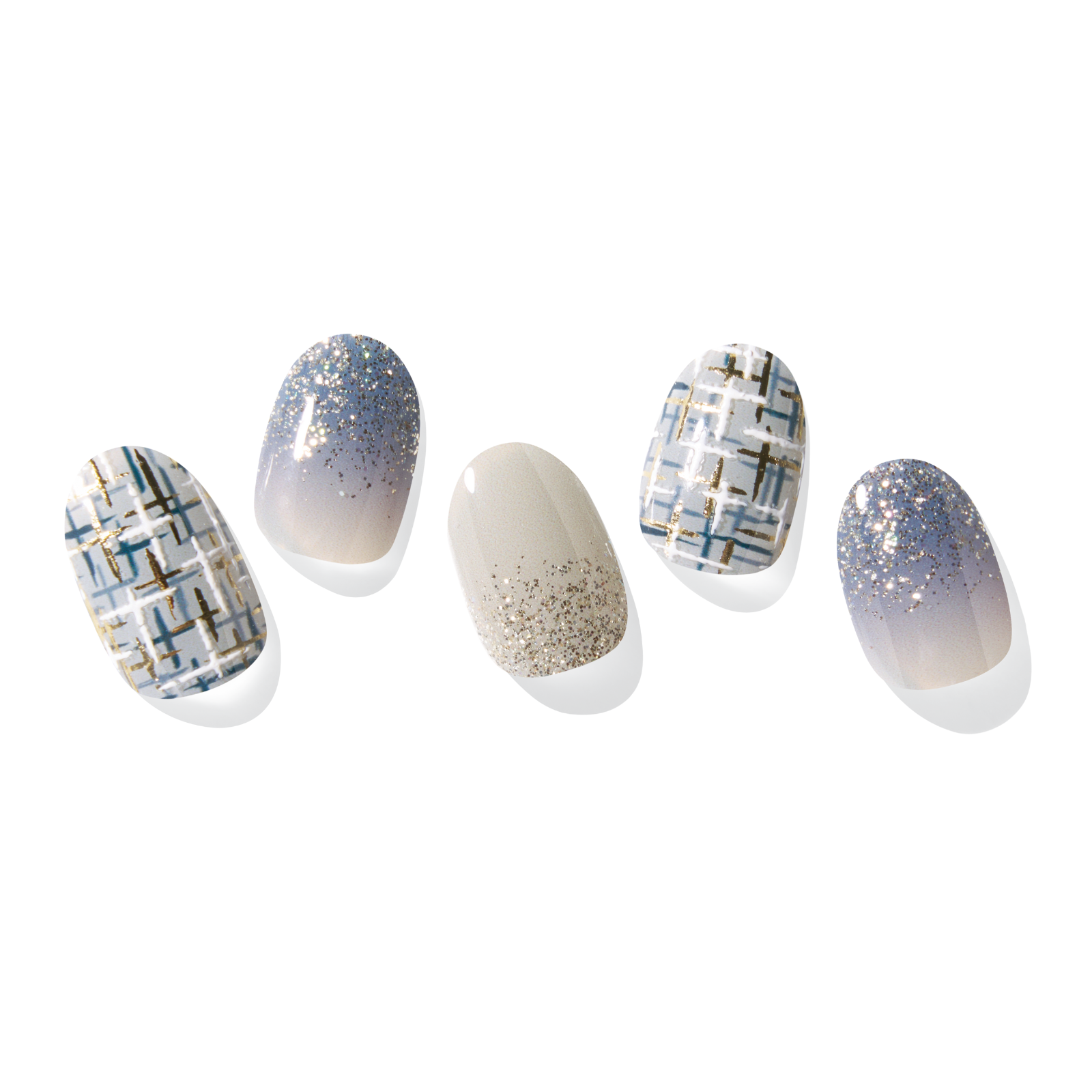 This pattern design is inspired by tweed jackets, a staple of the Fall/Winter season, that instantly elevate any outfit with a casual elegance. The design combines a sophisticated, muted blue colorway with a sparkling gold foil and a white 3D finish for a tweed pattern. A serene blue and gray ombre is added to complete the look with subtle yet intricate details.